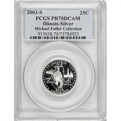 <B>2003-S 25C Illinois Silver PR70 Deep Cameo PCGS.</B></I> Michael Fuller Collection. PCGS Population (78/0). NGC Census: (0/0). Numismedia Wsl. Price for NGC/PCGS coin in PR70: $220. (#913038)<BR><BR><b>Shipping:</b> Coins & Currency (<a target="_blank" href="http://www.heritageauctions.com/common/shipping.php">view shipping information</a>)