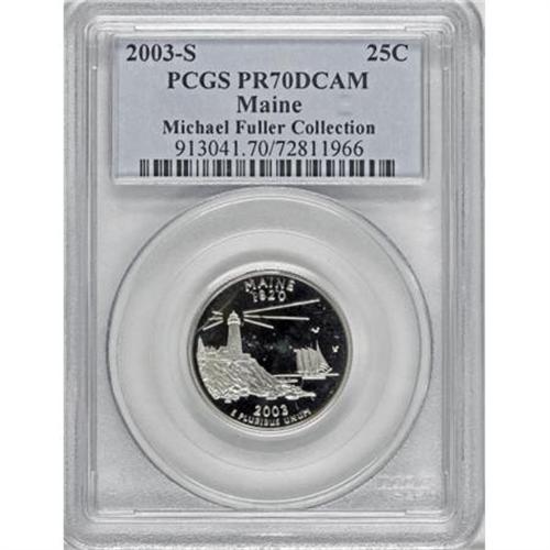 <B>2003-S 25C Maine Clad PR70 Deep Cameo PCGS.</B></I> Michael Fuller Collection. PCGS Population (69/0). NGC Census: (0/0). Numismedia Wsl. Price for NGC/PCGS coin in PR70: $100. (#913041)<BR><BR><b>Shipping:</b> Coins & Currency (<a target="_blank" href="http://www.heritageauctions.com/common/shipping.php">view shipping information</a>)