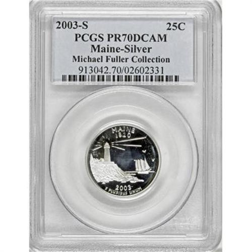 <B>2003-S 25C Maine Silver PR70 Deep Cameo PCGS.</B></I> Michael Fuller Collection. PCGS Population (78/0). NGC Census: (1170/0). Numismedia Wsl. Price for NGC/PCGS coin in PR70: $220. (#913042)<BR><BR><b>Shipping:</b> Coins & Currency (<a target="_blank" href="http://www.heritageauctions.com/common/shipping.php">view shipping information</a>)
