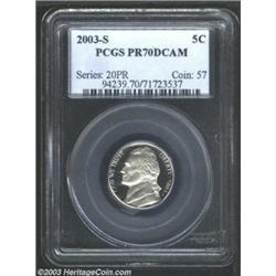 <TABLE cellSpacing=0 cellPadding=0 width="100%" bgColor=#000000 border=0><TBODY><TR><TD width="100%"><TABLE cellSpacing=1 cellPadding=3 width="100%" border=0><TBODY><TR><TD width="100%" bgColor=#79735c><FONT face=arial color=#ffffff size=3><B>Description</B> </FONT></TD></TR><TR><TD width="100%" bgColor=#ffffff><FONT face=arial size=2><B>2003-S 5C PR70 Deep Cameo PCGS.</B></I> A brilliant black and white Superb Gem, fully struck and seemingly pristine. </FONT></TD></TR></TBODY></TABLE></TD></TR></TBODY></TABLE><BR><A name=PricesRealized></A><TABLE cellSpacing=0 cellPadding=0 width="100%" bgColor=#000000 border=0><TBODY><TR><TD width="100%"><TABLE cellSpacing=1 cellPadding=3 width="100%" border=0><TBODY><TR><TD width="100%" bgColor=#79735c><A name=PR><FONT face=arial color=#ffffff size=3><B>Previous Prices from Heritage Auctions</B> </FONT></A></TD></TR><TR><TD bgColor=#f6f6ed>No Prior Data Recorded </TD></TR><TR><TD bgColor=#ffffff><FONT face=arial size=1 ?>PLEASE NOTE: All prices realized reflect the final hammer price PLUS the buyer's premium in auctions that charge a buyer's premium. Each item has a notation at the top of the listing indicating whether that lot included a buyer's premium. Example: A item that sells with a final hammer price of $100 and a 20% buyer's premium will display with a price realized of $120. All information listed is intended to be as accurate as possible, but errors are possible. Please use this guide carefully and inform us of any inaccuracies. </FONT></TD></TR></TBODY></TABLE></TD></TR></TBODY></TABLE><BR><TABLE cellSpacing=0 cellPadding=0 width="100%" bgColor=#000000 border=0><TBODY><TR><TD width="100%"><TABLE cellSpacing=1 cellPadding=3 width="100%" border=0><TBODY><TR><TD width="100%" bgColor=#79735c colSpan=6><FONT face=arial color=#ffffff size=3><B>Price Guide*</B> </FONT></TD></TR><TR bgColor=#f6f6ed><TD align=middle><B>Grade</B> </TD><TD align=middle><B>Coin World<BR>(Trends)</B> </TD><TD align=middle><B>Numismedia<BR>Retail</B> </TD><TD align=middle><B>Numismedia<BR>Wholesale</B> </TD><TD align=middle><B>Coin<BR>Universe</B> </TD><TD align=middle><B>Heritage<BR>Value Index</B> </TD></TR><TR bgColor=#ffffff><TD align=middle>69</TD><TD align=right>---</TD><TD align=right>---</TD><TD align=right>---</TD><TD align=right>---</TD><TD align=right>($1.00)</TD></TR><TR style="FONT-WEIGHT: bold" bgColor=#cccfdd><TD align=middle>70</TD><TD align=right>---</TD><TD align=right>---</TD><TD align=right>---</TD><TD align=right>---</TD><TD align=right>($1.00)</TD></TR><TR bgColor=#ffffff><TD colSpan=6><FONT size=1>*All information listed is intended to be as accurate as possible, but errors are possible. No item may be returned or refused based on this information which is provided as a service to our customers. You should contact each pricing source directly to determine the accuracy of this information. </FONT></TD></TR></TBODY></TABLE></TD></TR></TBODY></TABLE><BR><TABLE cellSpacing=0 cellPadding=0 width="100%" bgColor=#000000 border=0><TBODY><TR><TD width="100%"><TABLE cellSpacing=1 cellPadding=3 width="100%" border=0><TBODY><TR><TD width="100%" bgColor=#79735c><FONT face=arial color=#ffffff size=3><B>Population Guide</B> </FONT></TD></TR><TR bgColor=#ffffff><TD align=middle> Important notice: Heritage usually auctions material at the rate of 200-250 lots per hour. On some occasions eBay Live bid software or the Internet may not be able to keep up with the pace of the auction. We recommend placing a realistic absentee bid now as insurance to avoid disappointment. Occasionally the auctioneer may eliminate or reject an eBay Live bid, and the auctioneer may also reopen a lot after the close of the eBay live bidding (usually because we missed an audience bid), and may reject your bid even if it shows you as the winning bidder. By bidding via eBay Live, you agree that Heritage may award the lot to another bidder at its sole discretion under the circumstances described above or any other reasonable circumstances. Also please note that all Heritage lots purchased through eBay Live carry a 20% Buyer's Premium. Please make sure you read the Terms and Conditions before you bid.</TD></TR></TBODY></TABLE></TD></TR></TBODY></TABLE>