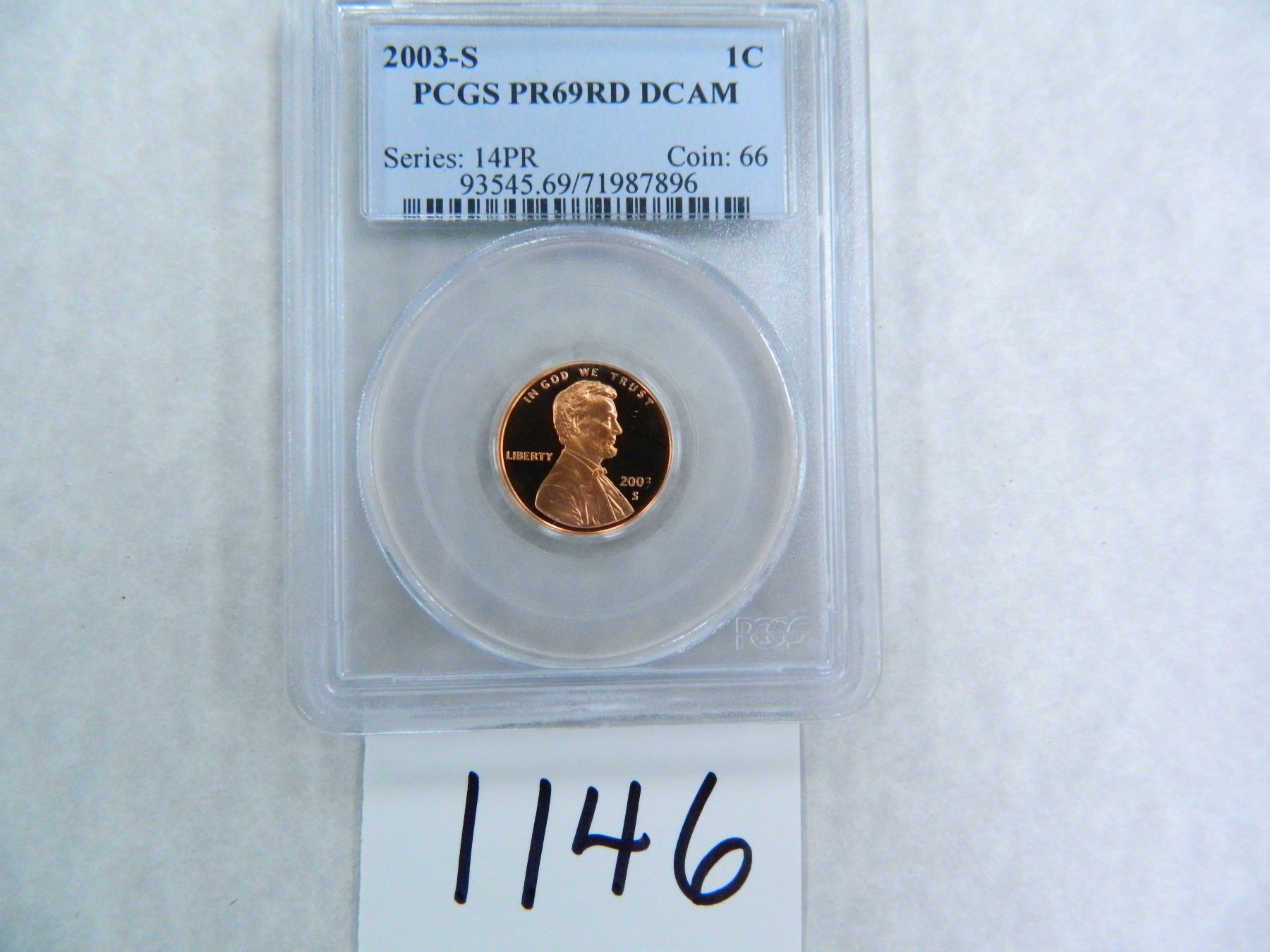2003-S One Cent PCGS graded PR69 RD DC