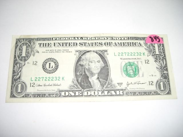 2003 SERIES A EXTRA RARE *SAME 6 DIGITS SERIAL DIGITS* $1.00 SERIAL # *L22722232K. NICE US DOLLAR*!! DOLLAR CAME OUT OF SAFE!! ***Coin, Currency & All Items Listed in this auction - Grades, Conditions and Values are not Safe Deposit Coins LLC Responsibilty. Grades, Condition and Values are determined by Consigner(s) & Buyers ONLY