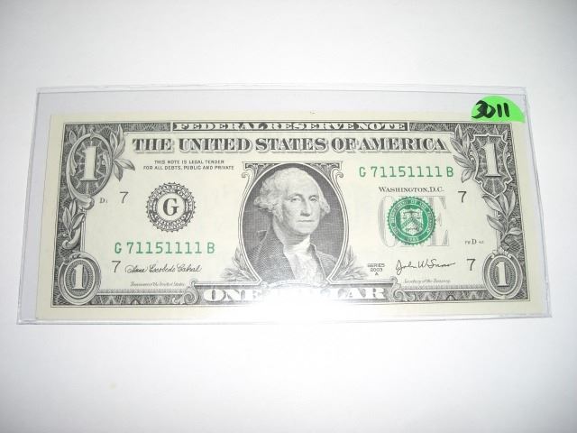 2003 SERIES A EXTREMELY RARE *HIGH GRADE-SAME 6 DIGITS* $1.00 SERIAL # G71151111B. DOLLAR CAME OUT OF SAFE!! ***Coin, Currency & All Items Listed in this auction - Grades, Conditions and Values are not Safe Deposit Coins LLC Responsibilty. Grades, Condition and Values are determined by Consigner(s) & Buyers ONLY