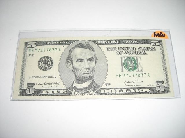 2003 SERIES A EXTREMELY RARE *SAME 6 DIGITS 7'S* $5.00 SERIAL # FE77177877A. CURRENCY BILL CAME OUT OF SAFE!! ***Coin, Currency & All Items Listed in this auction - Grades, Conditions and Values are not Safe Deposit Coins LLC Responsibilty. Grades, Condition and Values are determined by Consigner(s)
