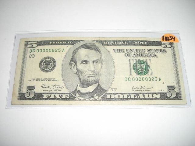 2003 SERIES EXTREMELY RARE *3 DIGIT SERIAL #* $5.00 SERIAL # DC00000825A. APPROX. VALUE $125.00+. CURRENCY BILL CAME OUT OF SAFE!! ***Coin, Currency & All Items Listed in this auction - Grades, Conditions and Values are not Safe Deposit Coins LLC Responsibilty. Grades, Condition and Values are determined by Consigner(s)