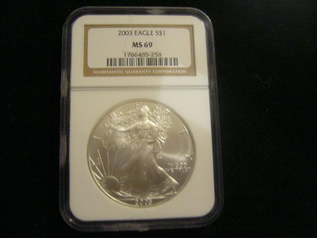 up for consideration is a 2003 silver eagle ms69. Please study the picture carefully before you place your bid. I am not a professional coin dealer or grader.