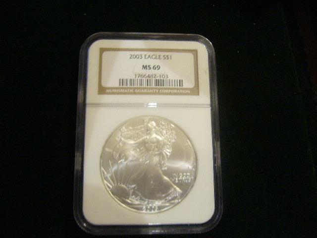 up for consideration is a 2003 silver eagle ms69 ngc graded. Please study the picture carefully before you place your bid. I am not a professional coin dealer or grader.