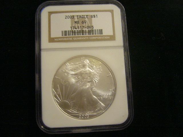 up for consideration is a 2003 silver eagle. Please study the picture carefully before you place your bid. I am not a professional coin dealer or grader.