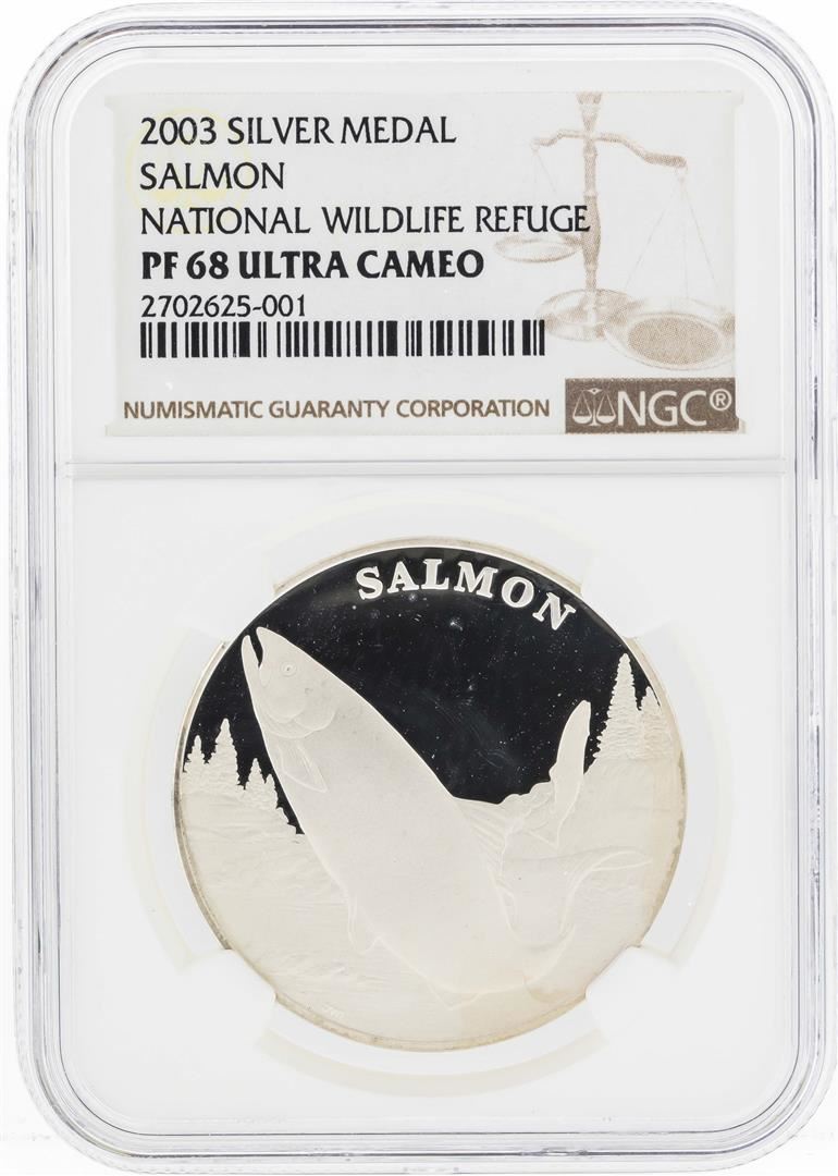One 2003 Silver Medal Salmon National Wildlife Refuge NGC PF 68 Ultra Cameo. NGC Certified.