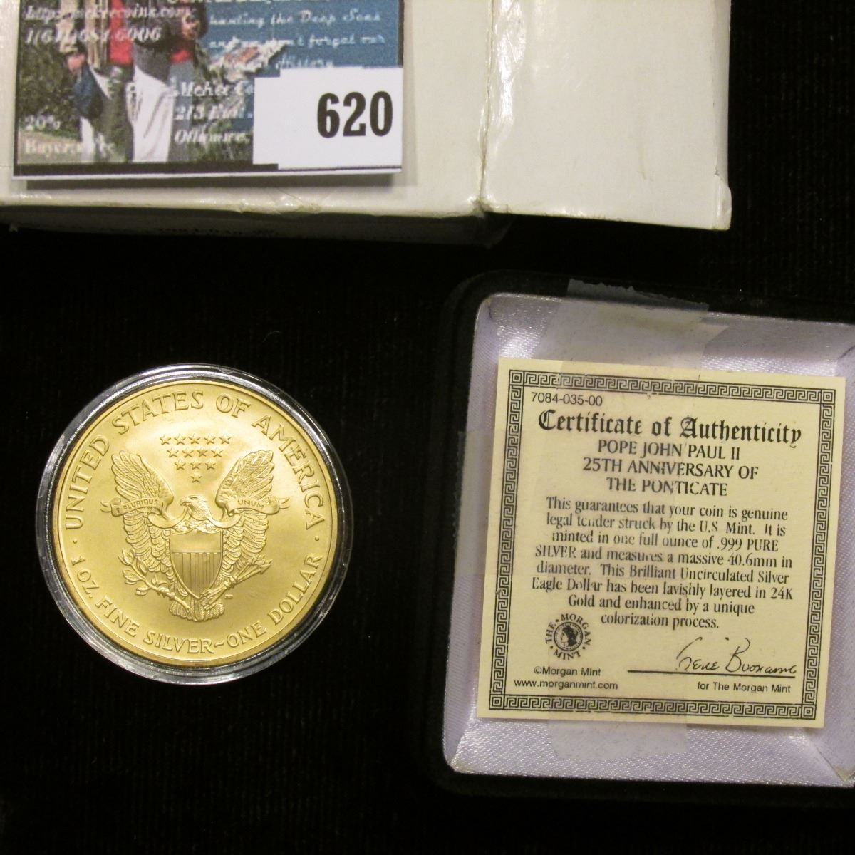 2003 U.S. Silver American Eagle .999 Fine One Dollar Coin with Colorization & Gold plating of the 25th Anniversary of the Pope John Paul II in original box as issued.