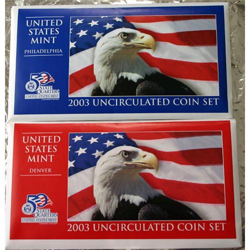 This is the 2003 United States Mint UNCIRCULATED Coin Set. This is a brilliant UNCIRCULATED SET OF COINS! You get all 20 COINS minted by the Denver and Philadelphia Mints in their ORIGINAL ENVENLOPES. Includes 10 State Quarters, Lincoln Cents, Jefferson Nickels, Roosevelt Dimes, Kennedy Halves & the FIRST ISSUE Sacagawea Dollars.