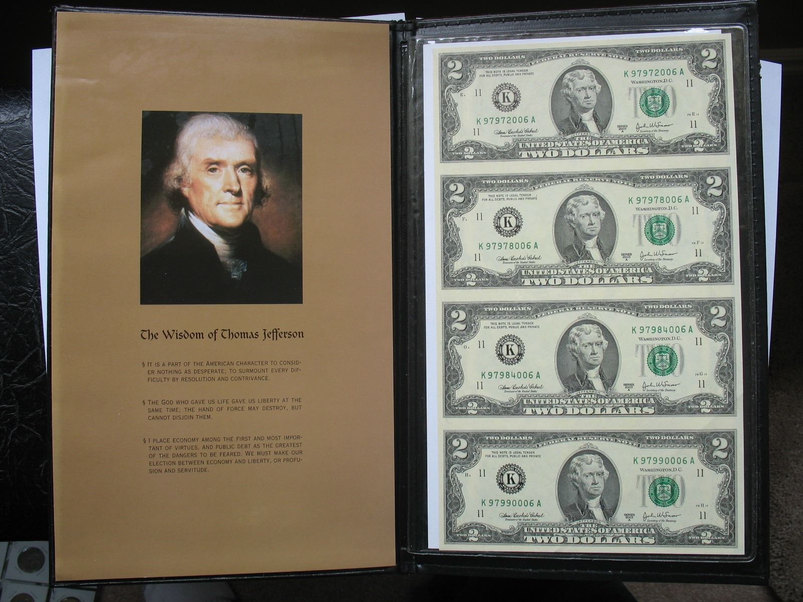 2003 United States $2.00 Bills - Uncut sheet of 4 - In folder