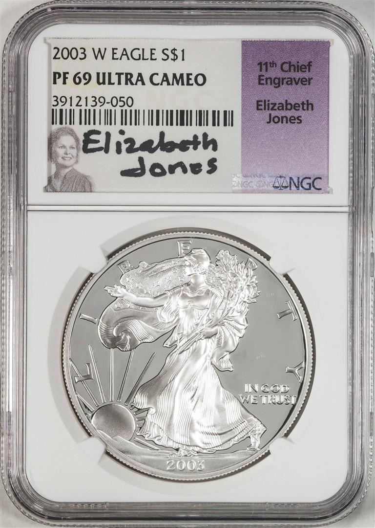 One 2003-W $1 Proof American Silver Eagle Coin NGC PF69 Ultra Cameo Elizabeth Jones Signature. NGC Certified.
