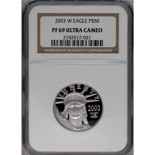<B>2003-W $50 Statue of Liberty Platinum Eagle PR69 Deep Cameo NGC.</B></I> NGC Census: (0/0). PCGS Population (744/67). Numismedia Wsl. Price: $735. (#921102)<BR><BR><b>Shipping:</b> Coins & Currency (<a target="_blank" href="http://www.heritageauctions.com/common/shipping.php">view shipping information</a>)