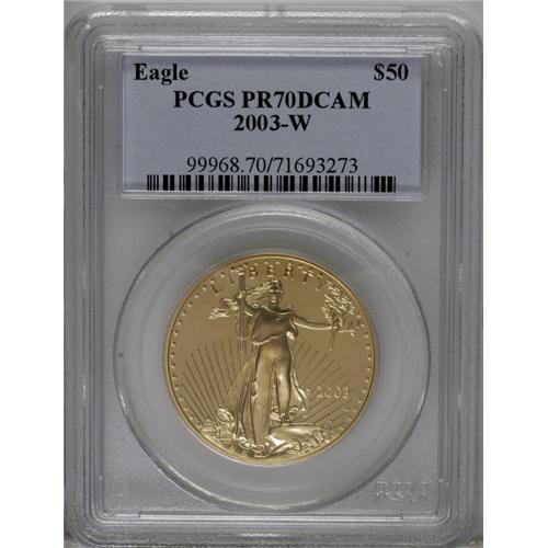 <B>2003-W $50 One-Ounce Gold Eagle PR70 Deep Cameo PCGS.</B></I> Exceptional detail and bold contrast are among the most important features of this gleaming, perfect coin. PCGS has assigned this grade to only 67 pieces (2/07).<BR><BR><b>Shipping:</b> Coins & Currency (<a target="_blank" href="http://www.heritageauctions.com/common/shipping.php">view shipping information</a>)