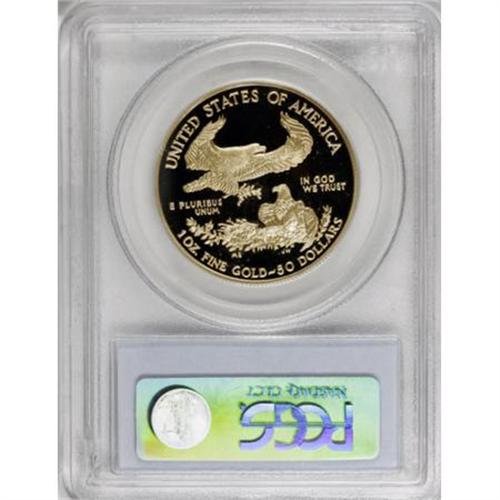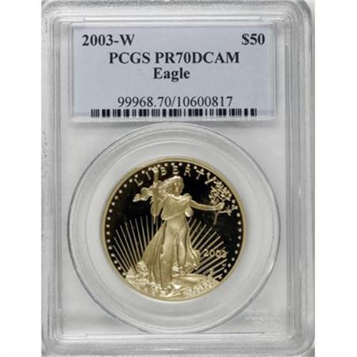 <B>2003-W $50 One-Ounce Gold Eagle PR70 Deep Cameo PCGS.</B></I> This gleaming 21st century Mint masterpiece offers breathtaking contrast and richly frosted, decisively struck devices. Fathomless fields offer impressive contrast. One of 85 pieces so graded by PCGS (1/08).<BR><BR><b>Shipping:</b> Coins & Currency (<a target="_blank" href="http://www.heritageauctions.com/common/shipping.php">view shipping information</a>)
