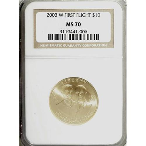<B>2003-W G$10 First Flight Gold Eagle MS70 NGC.</B></I> NGC Census: (0/0). PCGS Population (208/0). Numismedia Wsl. Price for NGC/PCGS coin in MS70: $675. (#21003)<BR><BR><b>Shipping:</b> Coins & Currency (<a target="_blank" href="http://www.heritageauctions.com/common/shipping.php">view shipping information</a>)
