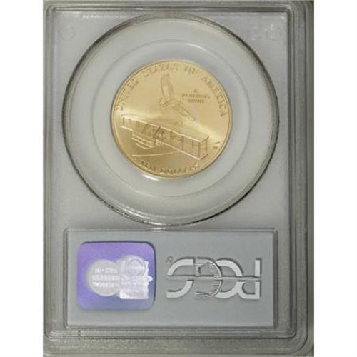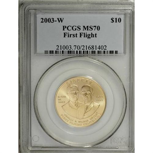 <B>2003-W G$10 First Flight Gold Eagle MS70 PCGS.</B></I> A sharply struck and technically perfect representative of this popular 21st century commemorative, shining with vibrant yellow-gold surfaces. The ten dollar denomination is unusual among American commemoratives; aside from the First Flight eagles, it appears on only the 1984 Olympics pieces and the 2000 Library of Congress bimetallic coins.<BR><BR><b>Shipping:</b> Coins & Currency (<a target="_blank" href="http://www.heritageauctions.com/common/shipping.php">view shipping information</a>)