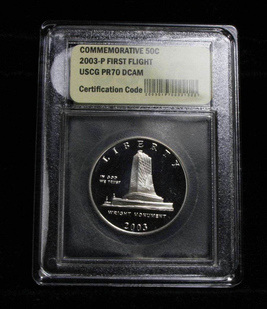Proof Commemorative Half Dollar Graded PR70 Deep Cameo by USCG. Beautiful Silver Commemorative celebrating the centennial of the first flight by the Wright Brothers. PCGS lists PR 70 at $800, harder in 70 than most. Estimated Value $250