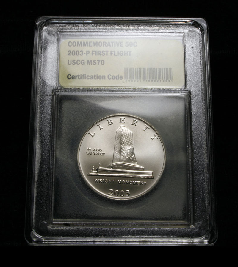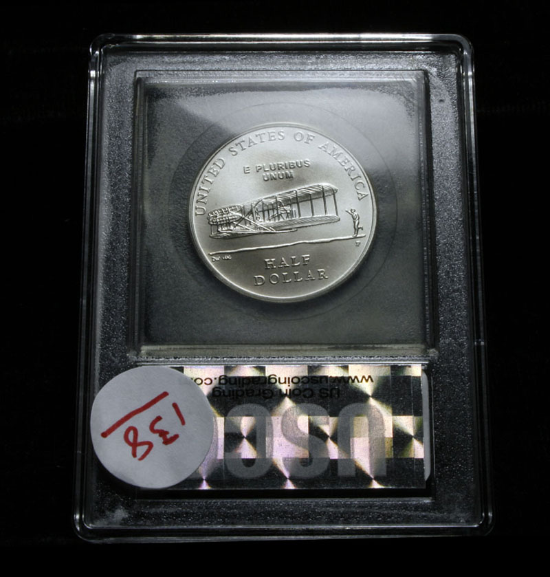 Uncirculated Commemorative Half Dollar Graded ms70 by USCG. Beautiful Silver Commemorative celebrating the centennial of the first flight by the Wright Brothers. Estimated Value $100