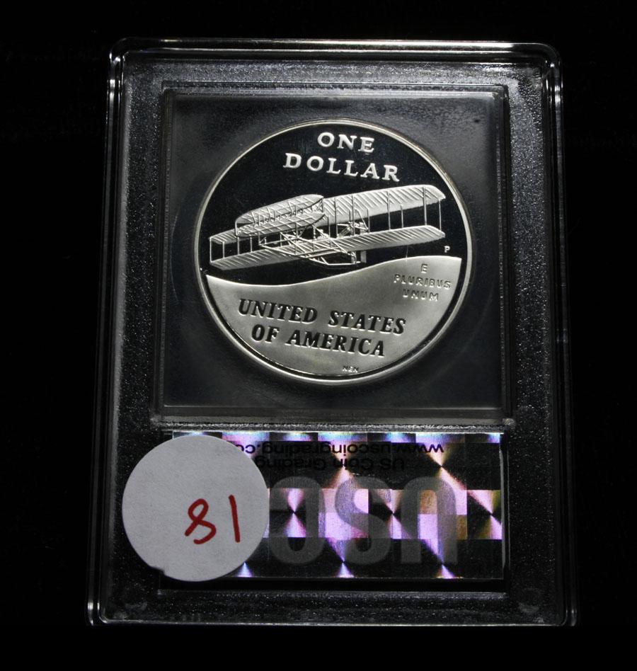Proof Commemorative Dollar Graded PR70 Deep Cameo by USCG. Beautiful Silver Commemorative celebrating the centennial of the first flight by the Wright Brothers. PCGS lists PR 70 at $1000, harder in 70 than most. Estimated Value $300
