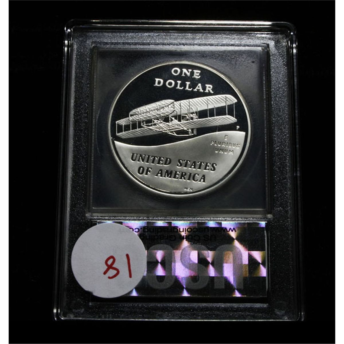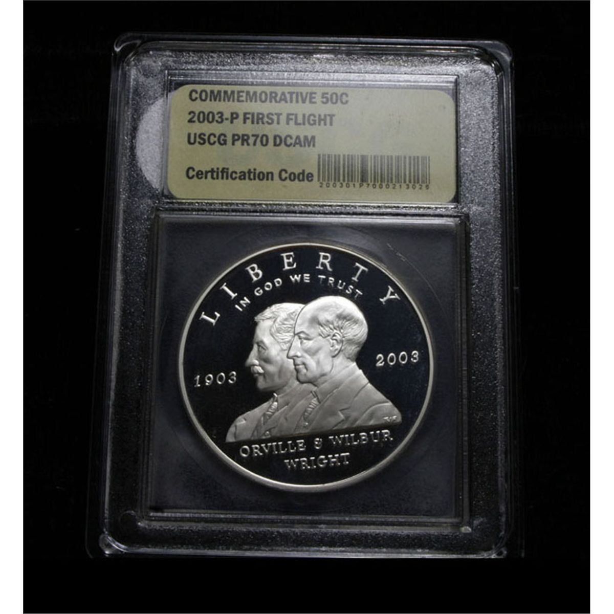 Proof Commemorative Dollar Graded PR70 Deep Cameo by USCG. Beautiful Silver Commemorative celebrating the centennial of the first flight by the Wright Brothers. PCGS lists PR70 at $1000, harder in 70 than most. Estimated Value $300