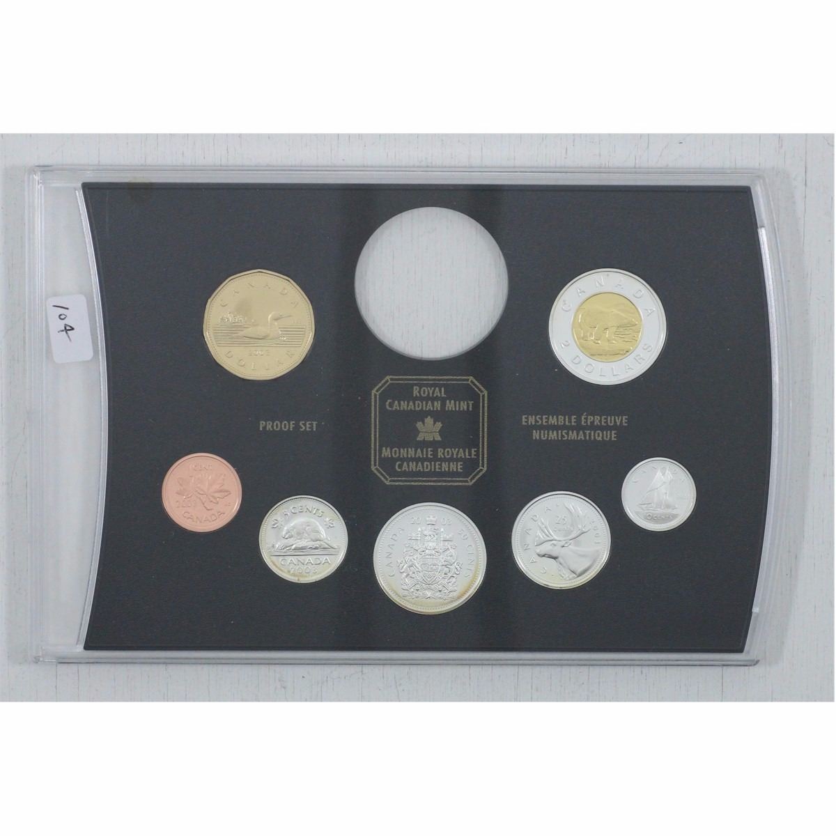 2003 silver frosted proof Canada 7-coin Set broken from the official Proof Double Dollar set issued by the RCM. You will receive the coins in the hard snap lock case with no silver dollar (has been removed). The 5ct, 10ct, 25ct, 50ct & $2 are sterling silver (silver coins may be lightly toned)