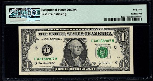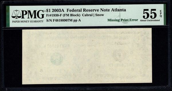 One 2003A $1 Error Missing 1st Print Atlanta FRN PMG 55EPQ.