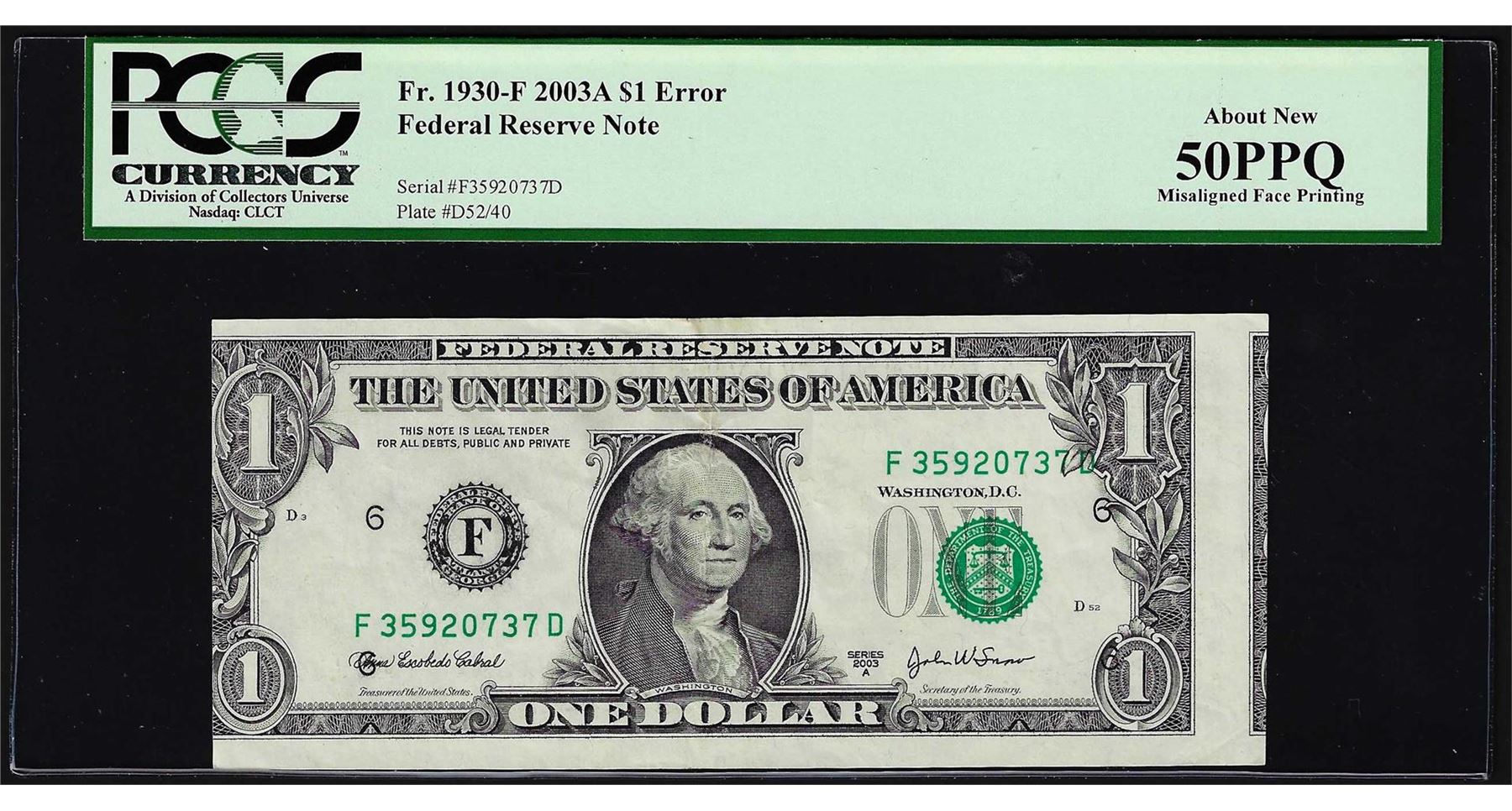 One 2003A $1 Federal Reserve ERROR Note Misaligned Overprint PCGS About New 50PPQ. PCGS Graded.