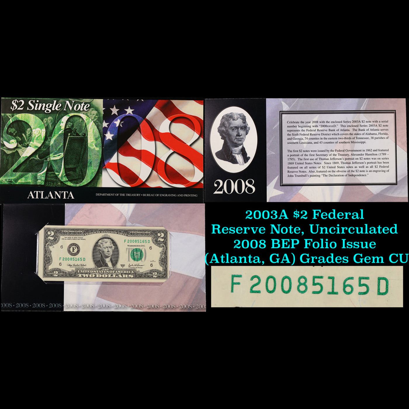 2003A $2 Federal Reserve Note, Uncirculated 2008 BEP Folio Issue (Atlanta, GA) Grades Gem CU