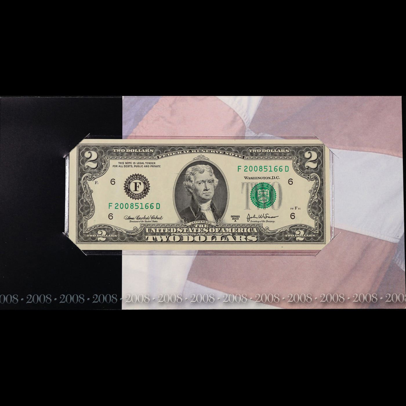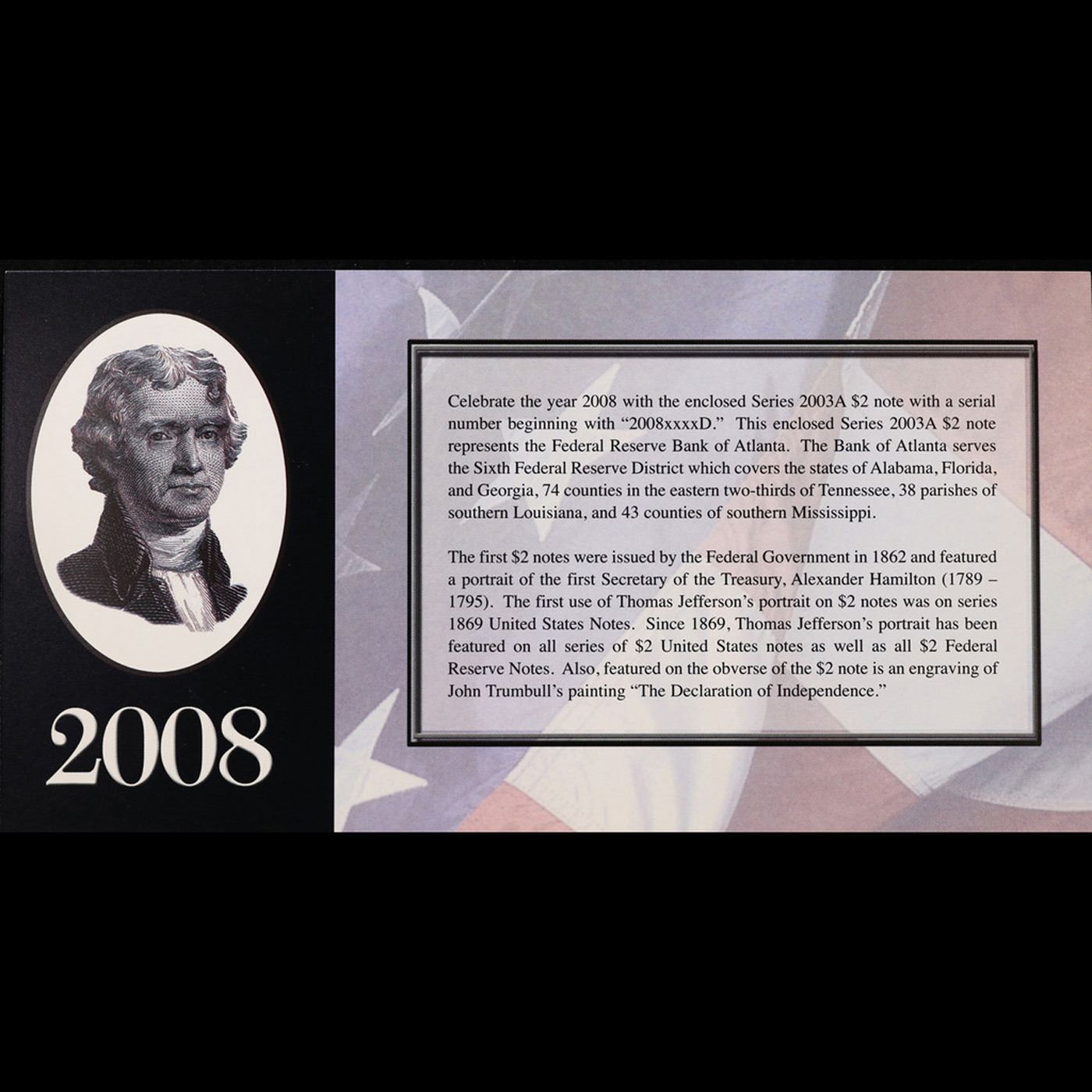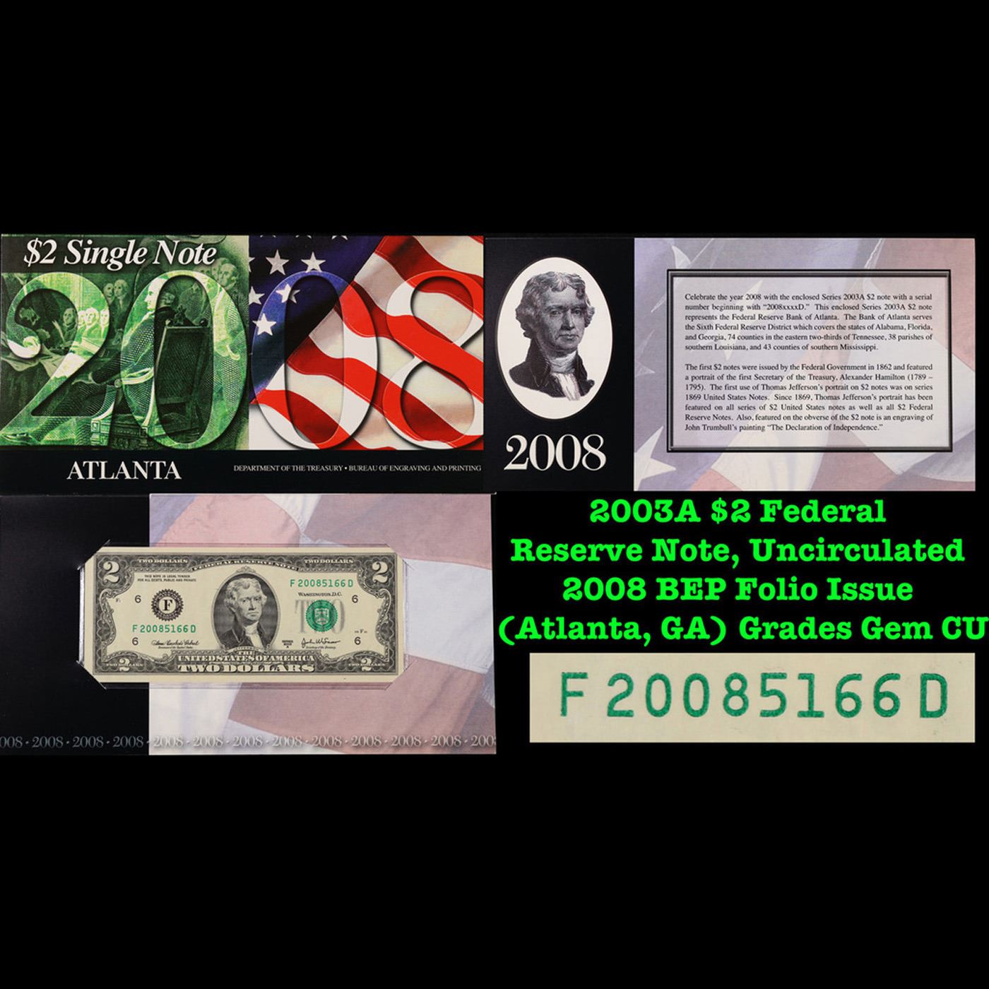 2003A $2 Federal Reserve Note, Uncirculated 2008 BEP Folio Issue (Atlanta, GA) Grades Gem CU