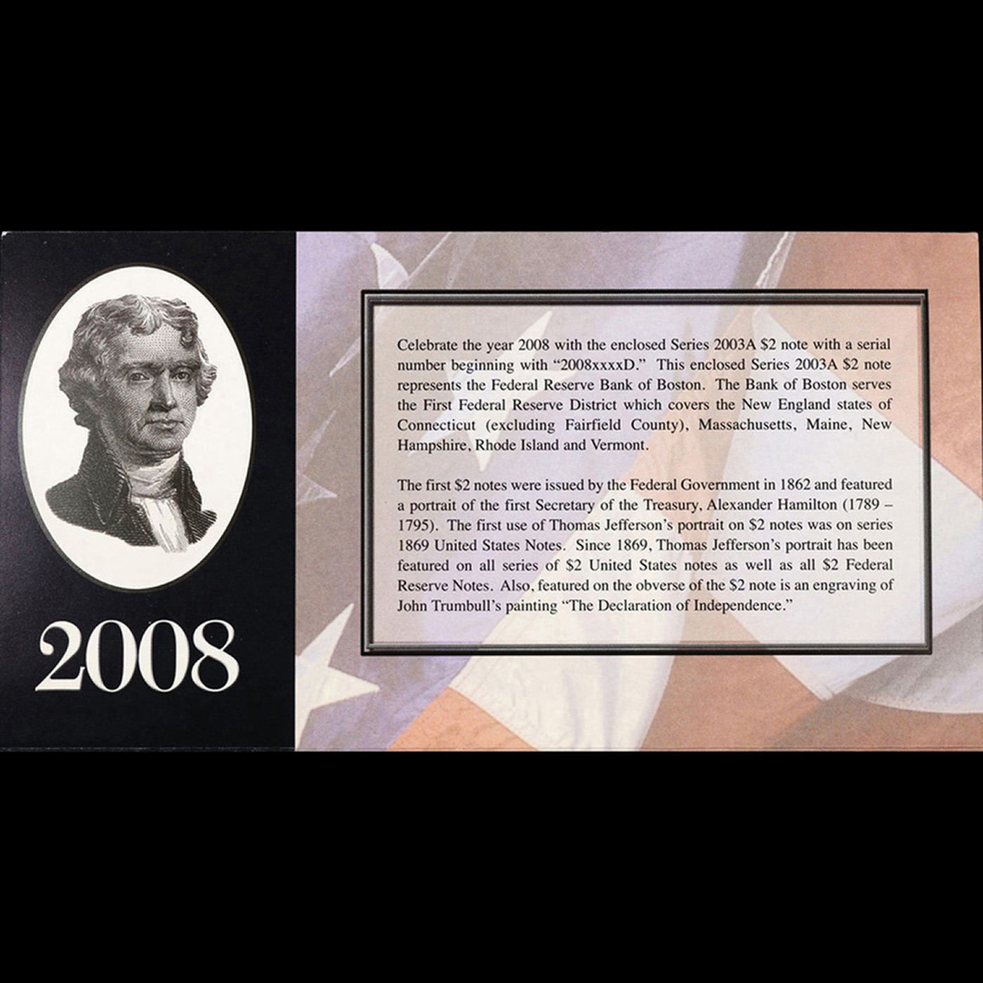 2003A $2 Federal Reserve Note, Uncirculated 2008 BEP Folio Issue (Boston, MA) Grades Gem CU.