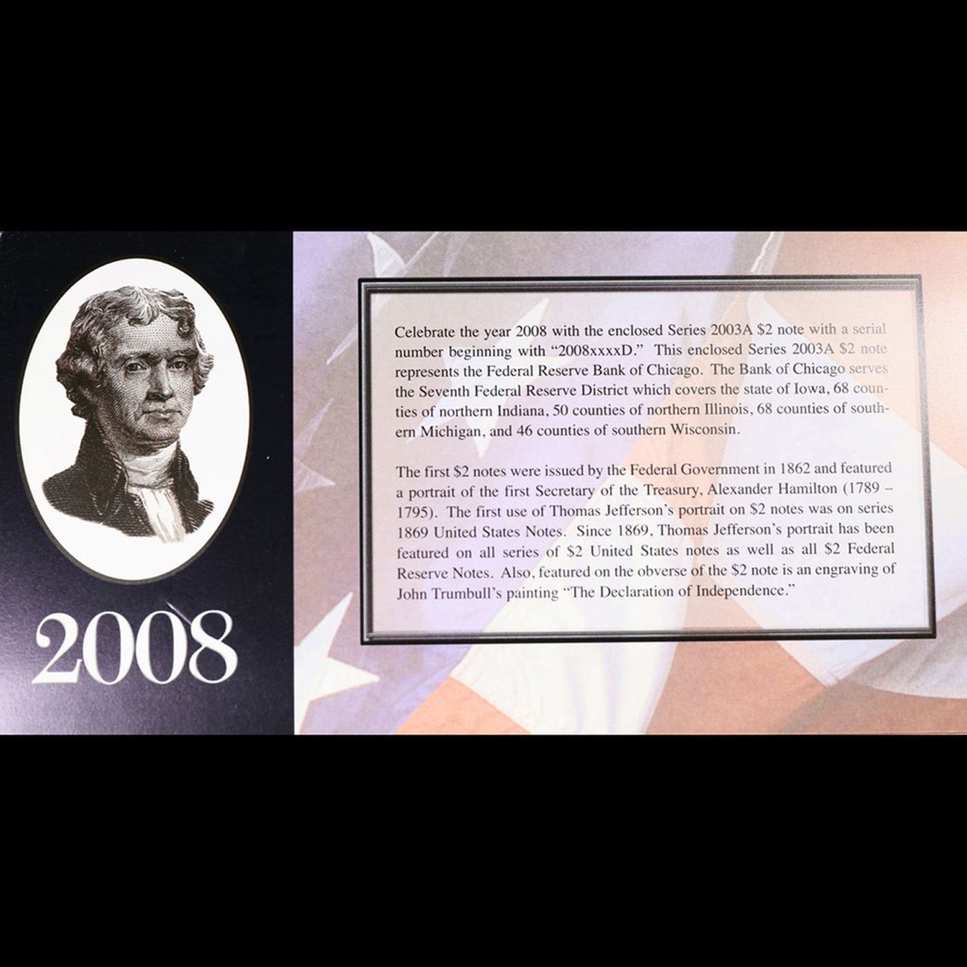 2003A $2 Federal Reserve Note, Uncirculated 2008 BEP Folio Issue (Chicago, IL) Grades Gem CU