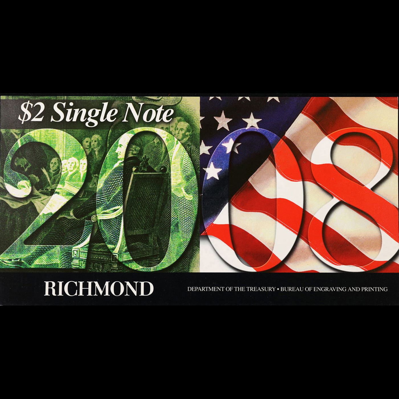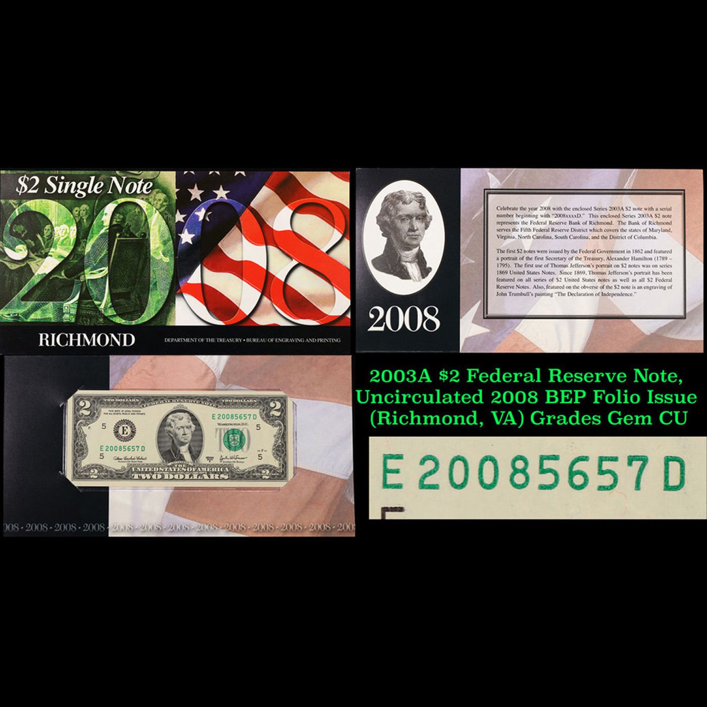 2003A $2 Federal Reserve Note, Uncirculated 2008 BEP Folio Issue (Richmond, VA) Grades Gem CU.