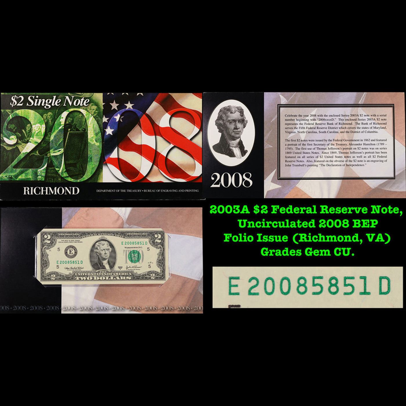 2003A $2 Federal Reserve Note, Uncirculated 2008 BEP Folio Issue (Richmond, VA) Grades Gem CU.