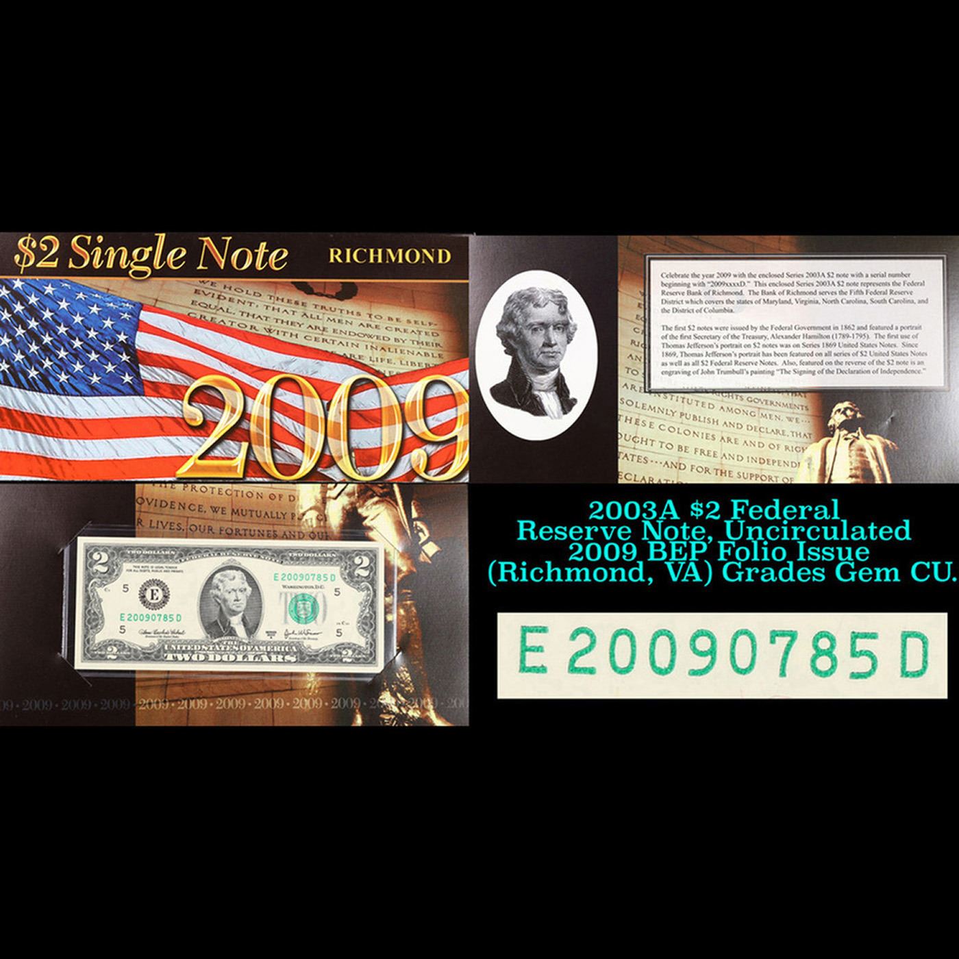 2003A $2 Federal Reserve Note, Uncirculated 2009 BEP Folio Issue (Richmond, VA) Grades Gem CU.