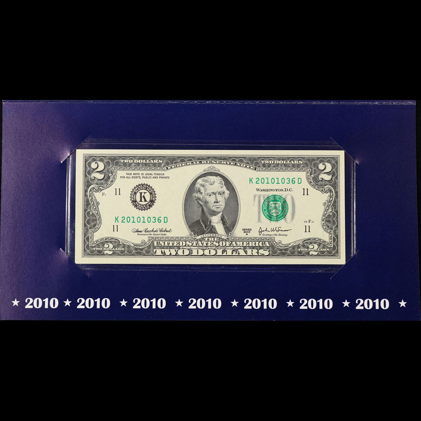 2003A $2 Federal Reserve Note, Uncirculated 2010 BEP Folio Issue (Dallas, TX) Grades Gem CU