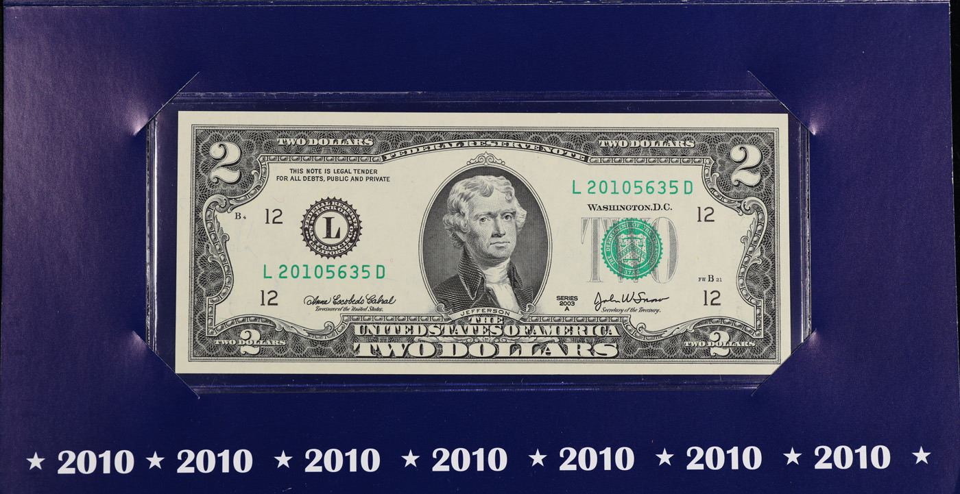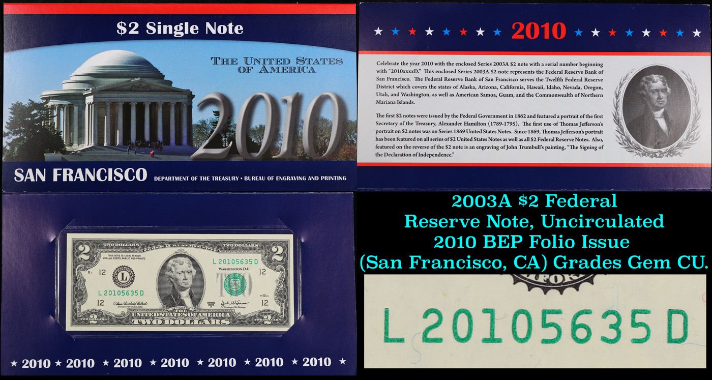 2003A $2 Federal Reserve Note, Uncirculated 2010 BEP Folio Issue (San Francisco, CA) Grades Gem CU