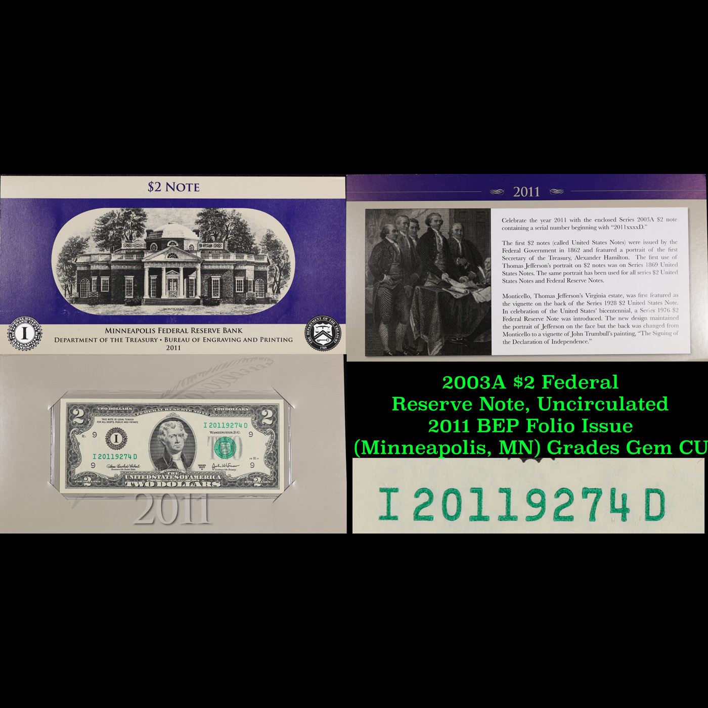 2003A $2 Federal Reserve Note, Uncirculated 2011 BEP Folio Issue (Minneapolis, MN) Grades Gem CU.