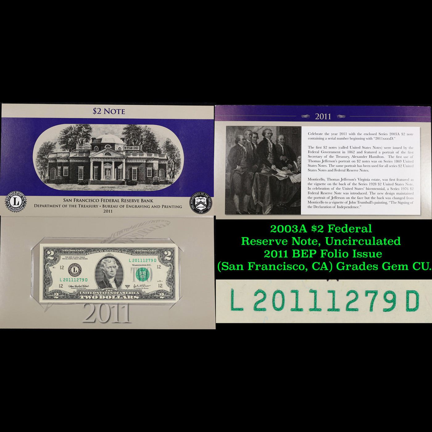 2003A $2 Federal Reserve Note, Uncirculated 2011 BEP Folio Issue (San Francisco, CA) Grades Gem CU.