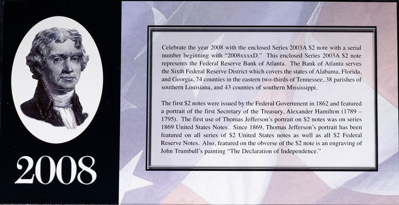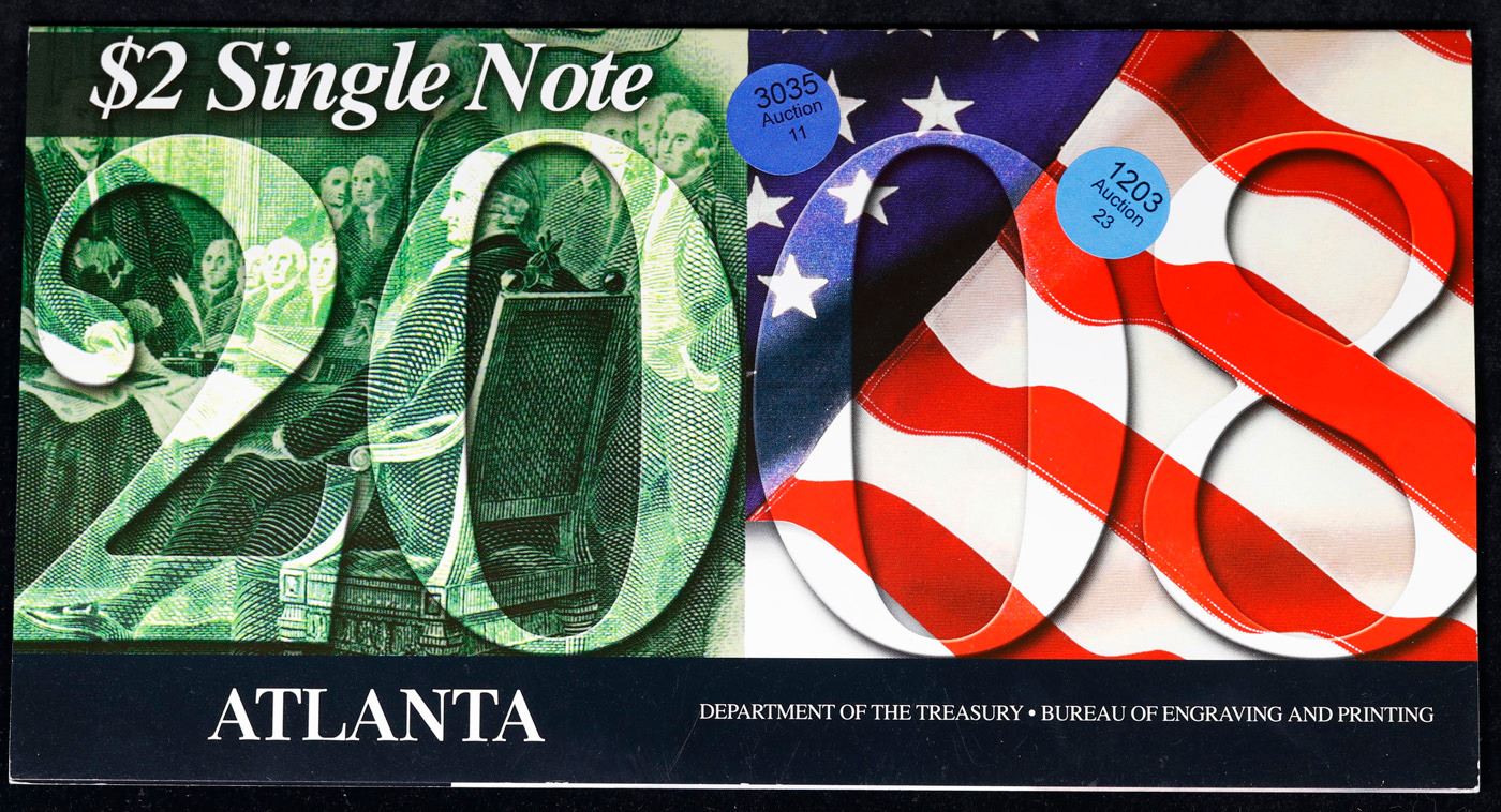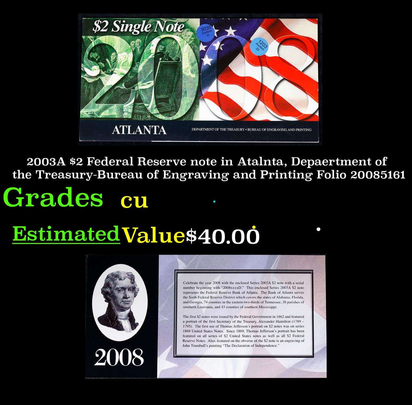 2003A $2 Federal Reserve note in Atalnta, Depaertment of the Treasury-Bureau of Engraving and Printing Folio 20085161 Grades CU.