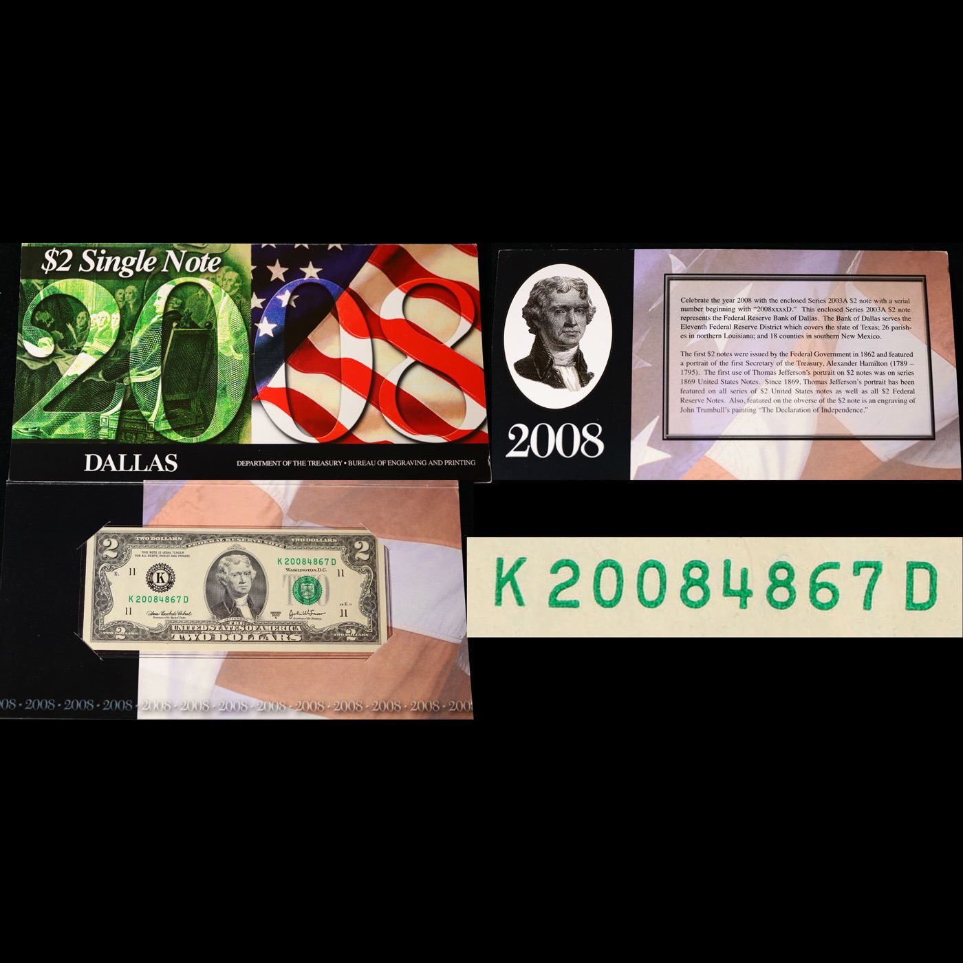 2003A $2 Green Seal Federal Reserve Note (Dallas, TX) In 2008 Series Department of Treasury Envelope Grades cu. Celebrate the year 2008 with the enclosed Series 2003A $2 note with a serial number beginning with "2008xxxxD." This enclosed Series 2003A $2 note represents the Federal Reserve Bank of Dallas.