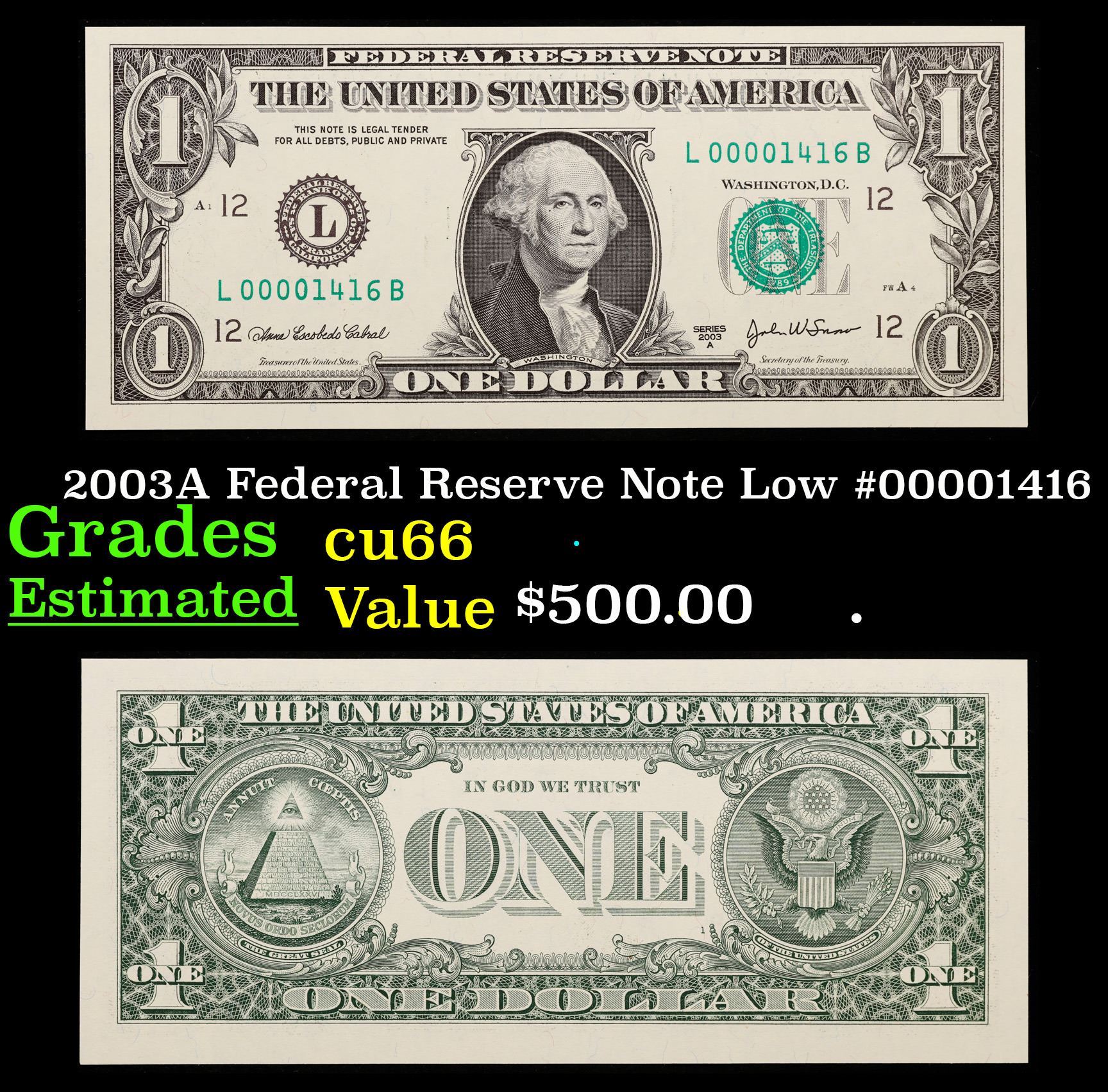2003A Federal Reserve Note Low #00001416 Grades Gem+ CU.