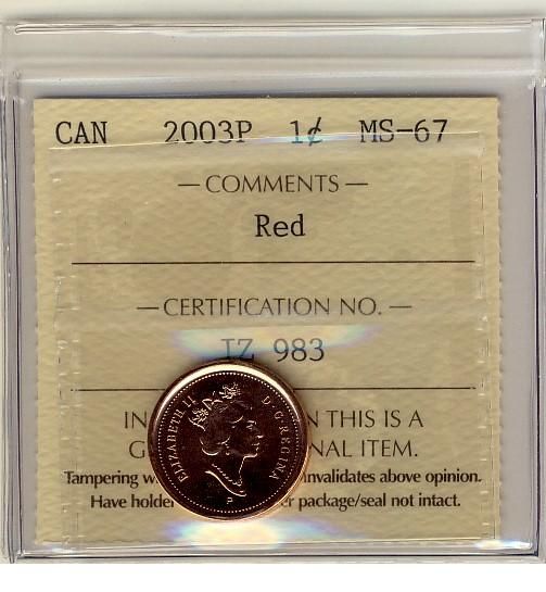 2003P 1¢ ICCS MS67 Full Red, A superb GEM example.