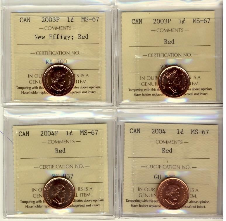 2003P, 2003 New Eff, 2004 & 2004P ICCS MS67RD. Lot of 4 coins