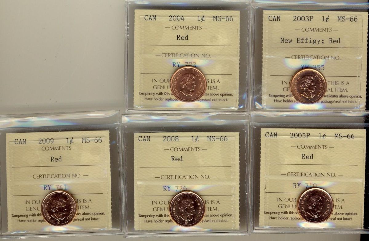 2003P, 2004, 2005P, 2008, 2009 1¢ ICCS MS66 Red, Lot of 5 coins,