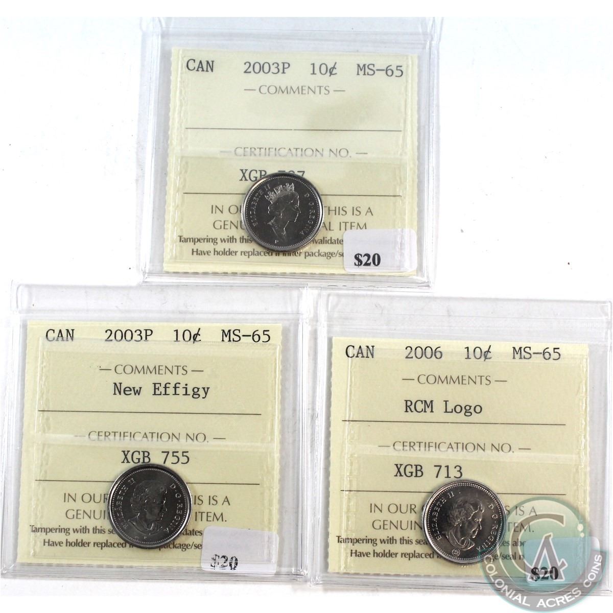 2003P OE, 2003P NE & 2006 Canada 10-cents ICCS Certified MS-65 (3 pcs)