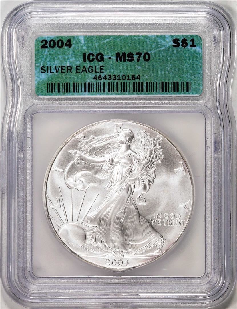 One 2004 $1 American Silver Eagle Coin ICG MS70. ICG Certified.