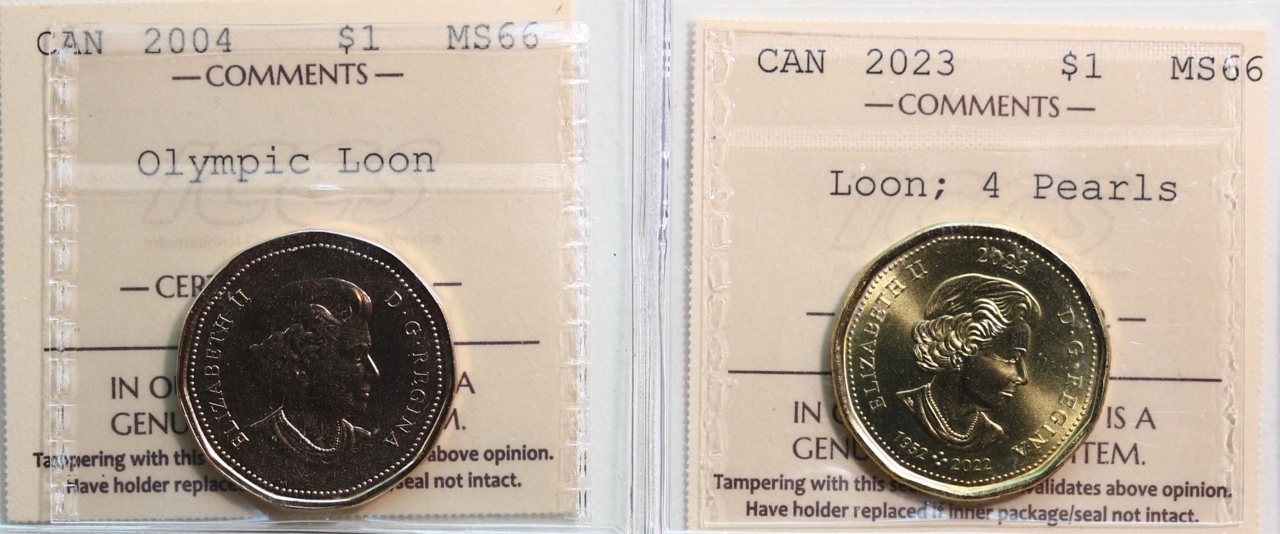 2004 $1 "Olympic Loon", 2023 "Loon: 4 Pearls". Both coins ICCS Gem Mint State-65