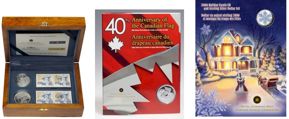 2004 $1 and 1/4 Euro Ile Saint-Croix Coins and Stamp set, 2005 $1 40th Anniversary of the Canadian Flag and 2006 $1 Holiday Car